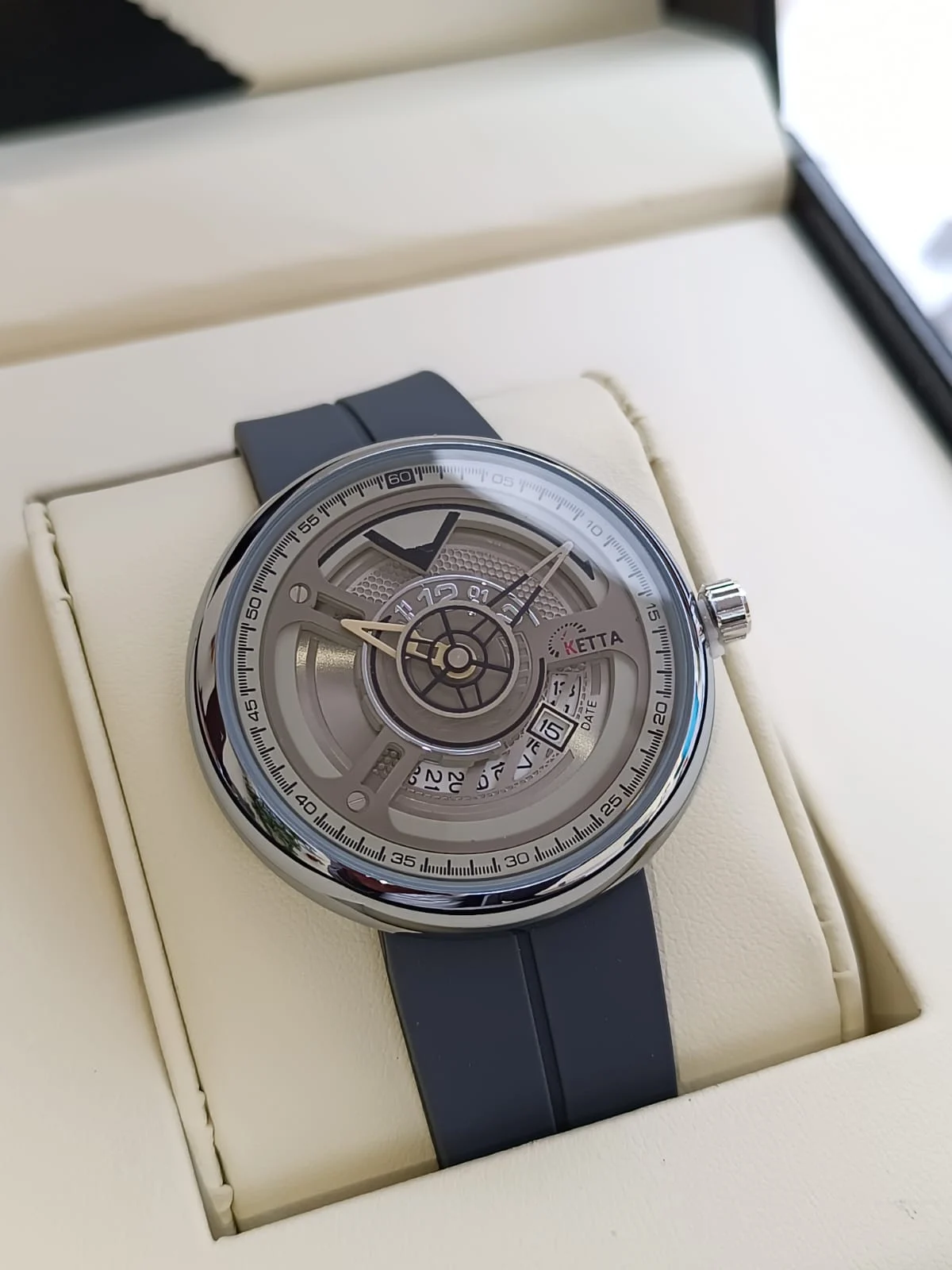 Diese exklusive KETTA Herrenuhr kombiniert modernes Skeleton-Design mit maritimer Eleganz. Das offene Zifferblatt zeigt das präzise Automatikwerk in Bewegung. Das hochwertige Armband in Navy-Blau harmoniert perfekt mit dem edlen Gehäuse in Grau-Weiß-Tönen – leicht glänzend, mit einem dezenten Schimmer, nahe an Weiß-Grau, für einen luxuriösen Look.